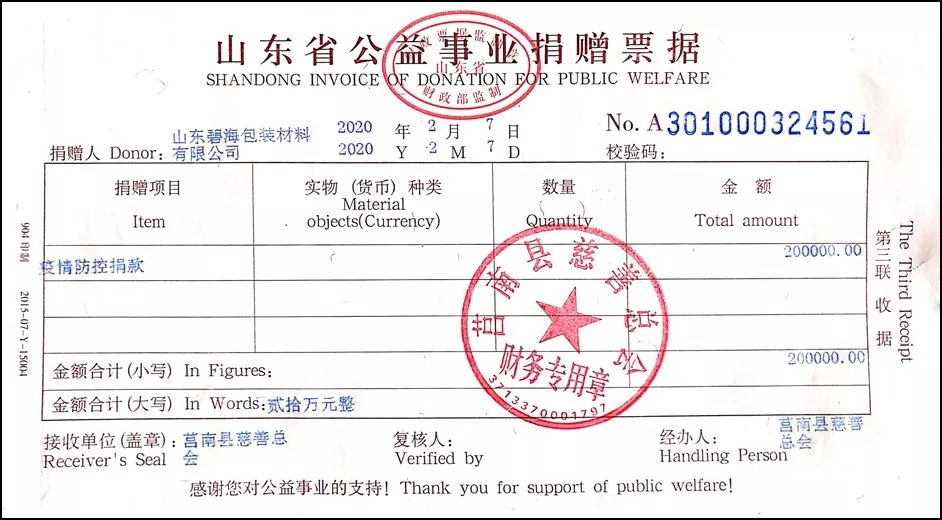 近來,新型冠狀病毒引起的肺炎疫情形勢嚴(yán)峻,時(shí)刻牽動著全國人民的心。共抗疫情,責(zé)任在肩,山東碧海包裝材料有限公司為了積極助力疫情防控,于2020年2月7日捐款人民幣20萬元,馳援抗擊疫情,所捐款項(xiàng)將用于抗擊新型冠狀病毒肺炎疫情。